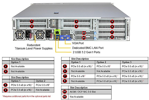 - PCI-Express (PCIe) Configuration Option A: 1 double-width PCIe 5.0 x16 FH/10.5"L slot 1 PCIe 5.0 x8 FHFL slot 1 double-width PCIe 5.0 x16 HHFL slot 1 PCIe 5.0 x16 AIOM slot (OCP 3.0 compatible) Option B: 2 PCIe 5.0 x8 FH/10.5"L slots 1 PCIe 5.0 x8 FHHL slot 1 double-width PCIe 5.0 x16 FHFL slot 1 PCIe 5.0 x16 AIOM slot (OCP 3.0 compatible)