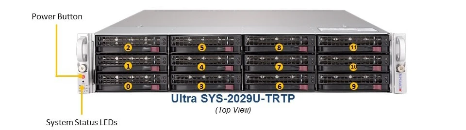 - 12 hot-swap 3.5-inch drive bays 12 SAS3 connectors via AOC option (4 hybrid ports - option 4 NVMe) Note: additional memory card required M.2 1 x M.2 PCI-E 3, 0x4 M-Key NVMe or 1 M.2 M-Key SATA3 (2240/2260/2280/22110) using optional riser card (see optional components list) 2 x M.2 PCI-E 3, 0x4 M-key NVMe (2260/2280/22110) using optional AOC-SLG3-2M2 card