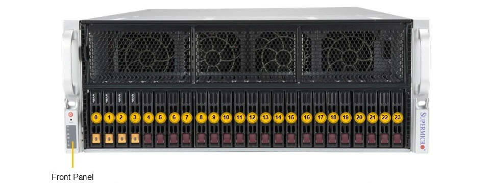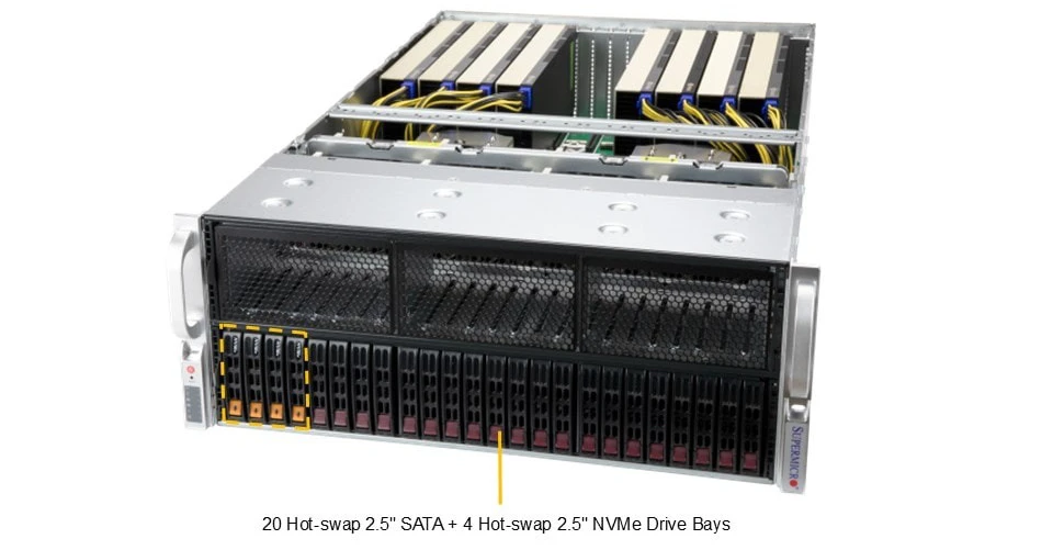- Up to 8 double-width NVIDIA PCIe GPUs: H100, H100 NVL, A16, A30, A40, L4, L40S, RTX 6000 Ada Generation, A100, RTX A5000, RTX A6000, RTX A5500, L40, RTX 4000 Ada Generation, RTX 4000 SFF Ada Generation, RTX 4500 Ada, RTX 5000 Ada, NVIDIA RTX PRO™ 6000 Blackwell Max-Q Workstation Edition, RTX A4000 AMD PCIe: Instinct™ MI210, Instinct™ MI100