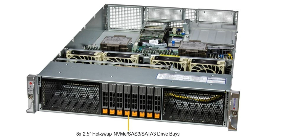- Option A* 4 double-width PCIe 5.0 x16 FH/10.5"L slots 2 PCIe 5.0 x16 AIOM slots (OCP 3.0 compatible) Option B* 8 PCIe 5.0 x 8 (in x 16) FH/10.5"L slots 2 PCIe 5.0 x16 AIOM slots (OCP 3.0 compatible) CXL support: Up to 4 CXL 1.1 x16/x8 devices 2 M.2 NVMe/SATA slots (B+M-key 2280/22110)