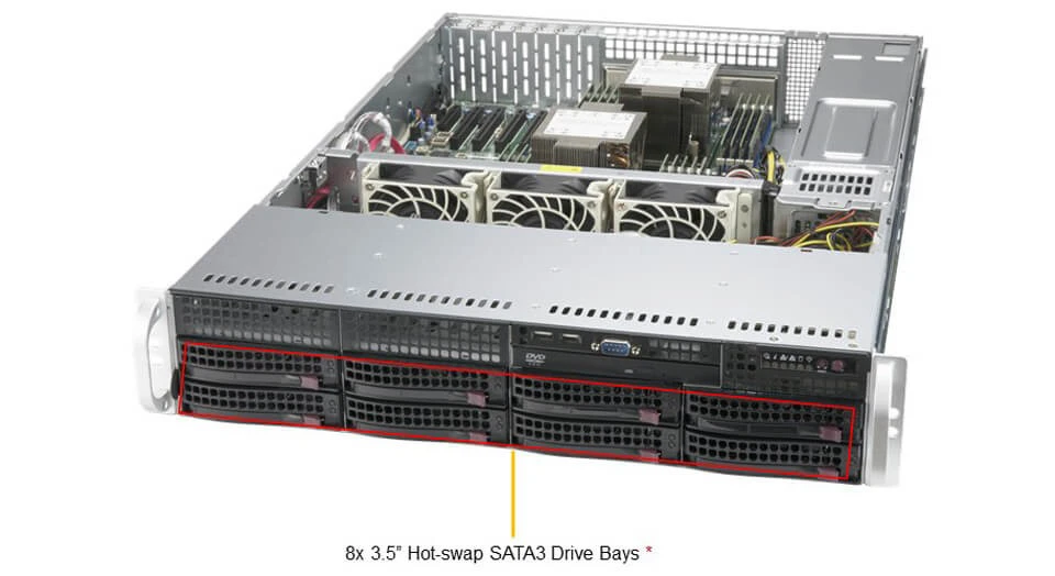 - 8 hot-swap 3.5-inch SATA3 drive bays 1 M.2 NVMe 1x slim DVD drive bay (optional)